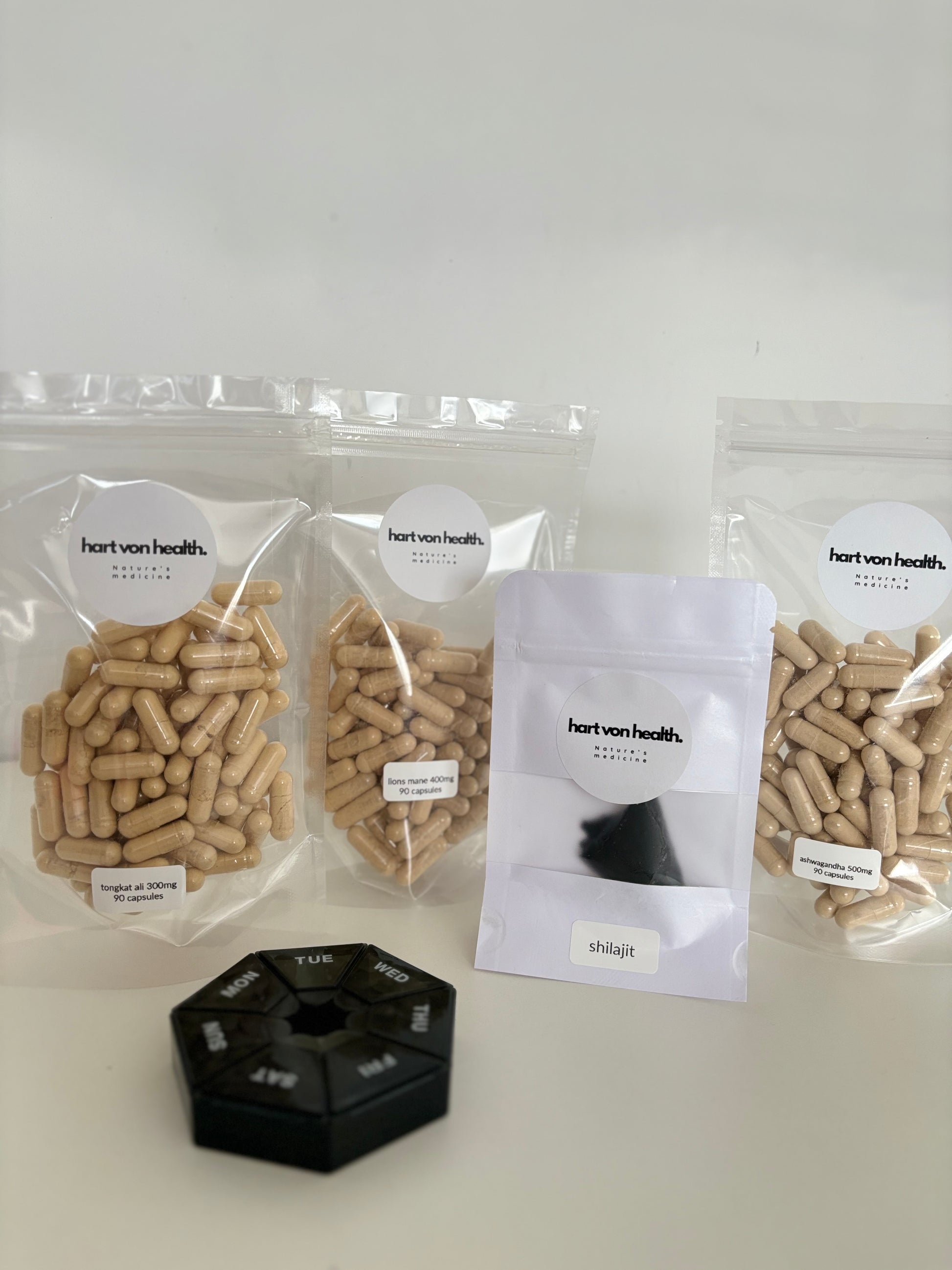 The combination of Lions mane, Shilajit, Tongkat ali and Ashwaganda help you become the strongest, healthiest version of yourself in body and mind. reduce stress and anxiety, improve mood and sleep.